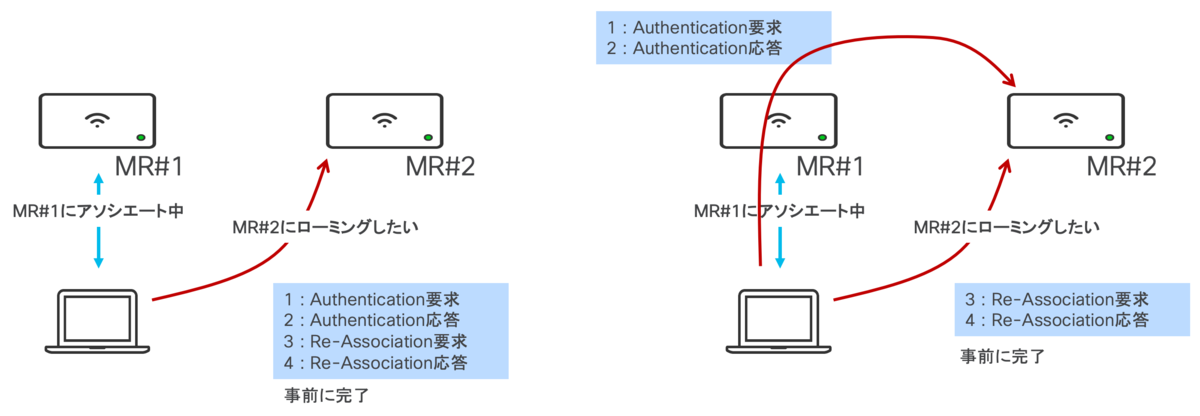 SKCやOKCはPMKをキャッシュ(もしくは共有)する仕組みとなってましたが、802.11rはクライアントがローミング前にローミング先のAPと予め初期ハンドシェークが行われPMKが計算できるようになるためローミングにおける手順を簡略化することが可能になります。