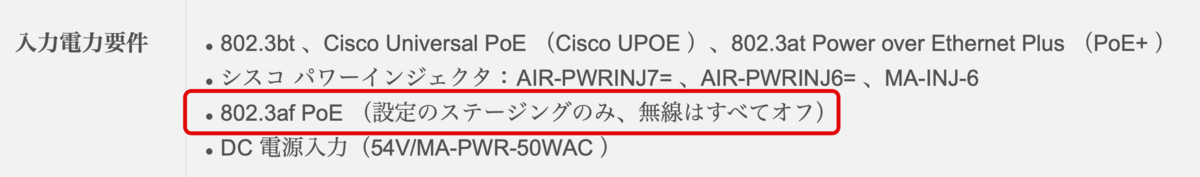CW9164をIOSのモードで利用する場合、キッティング時のみという制限はありますが802.3af PoEをサポートしています。